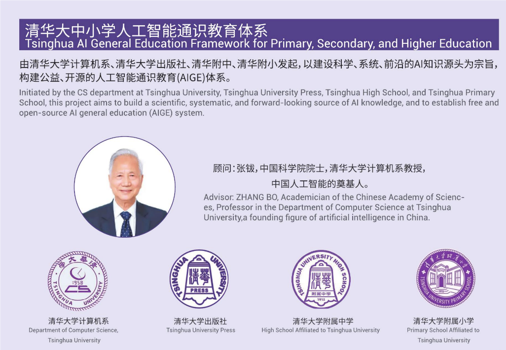 清华大中小学人工智能通识教育体系是由清华大学计算机系、清华大学出版社、清华附中、清华附小发起,以建设科学、系统、前沿的AI知识源头为宗旨,构建公益、开源的人工智能通识教育(AIGE)体系。中国科学院院士、清华大学计算机系张钹教授任中心顾问。