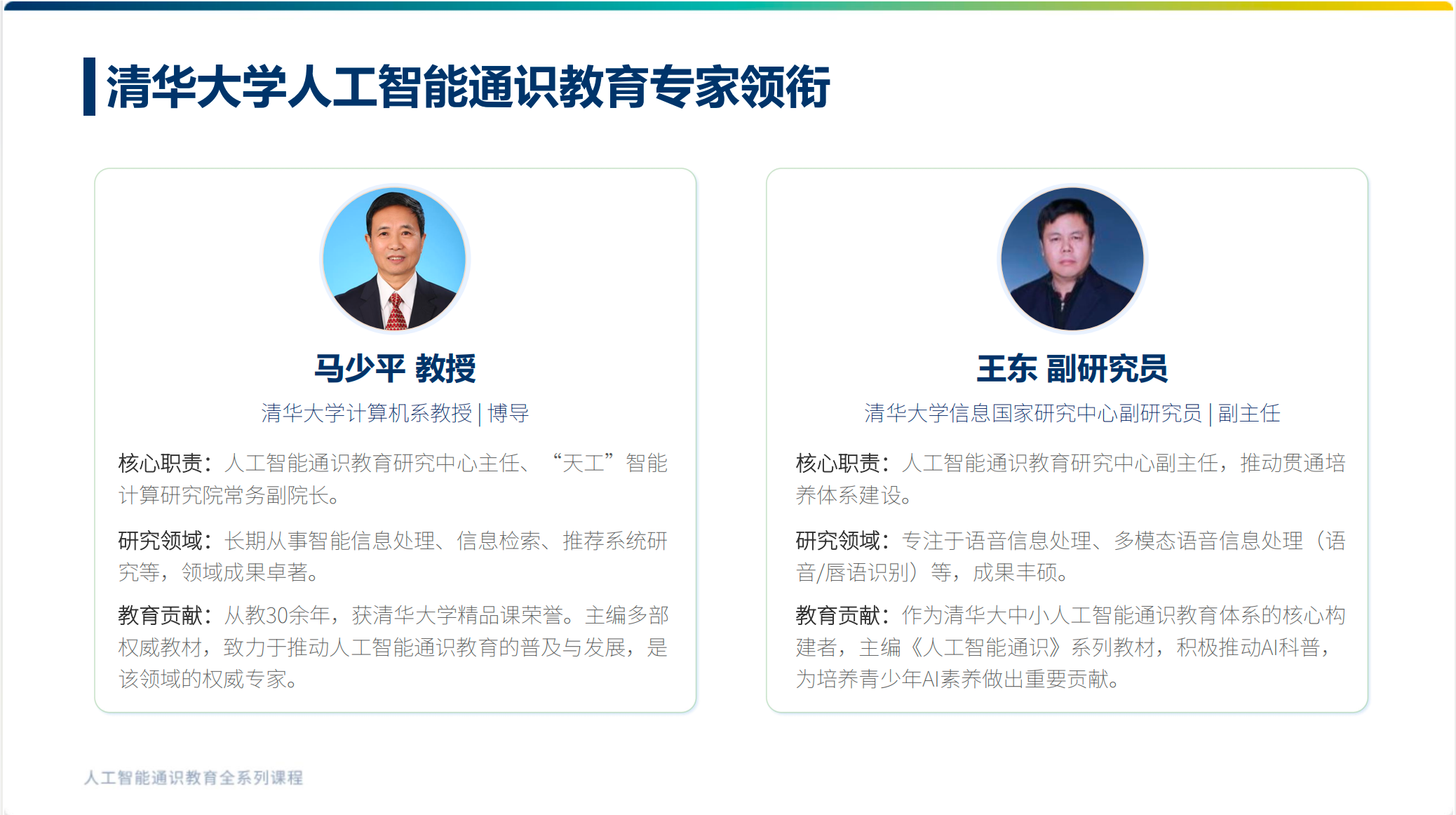 马少平教授作为清华大学人工智能通识教育的核心推动者,其团队在AI教育理论、知识体系建构方面拥有深厚积累;王东副研究员则在语音信息处理、多模态语音信息处理等前沿领域成果卓著。清华大学专家团队领衔,确保了课程从知识框架到教学逻辑都根植于深厚的学术积淀——既保持科学性、前瞻性,又贴合中小学认知规律,真正做到“不降维、不晦涩,权威且可教”。