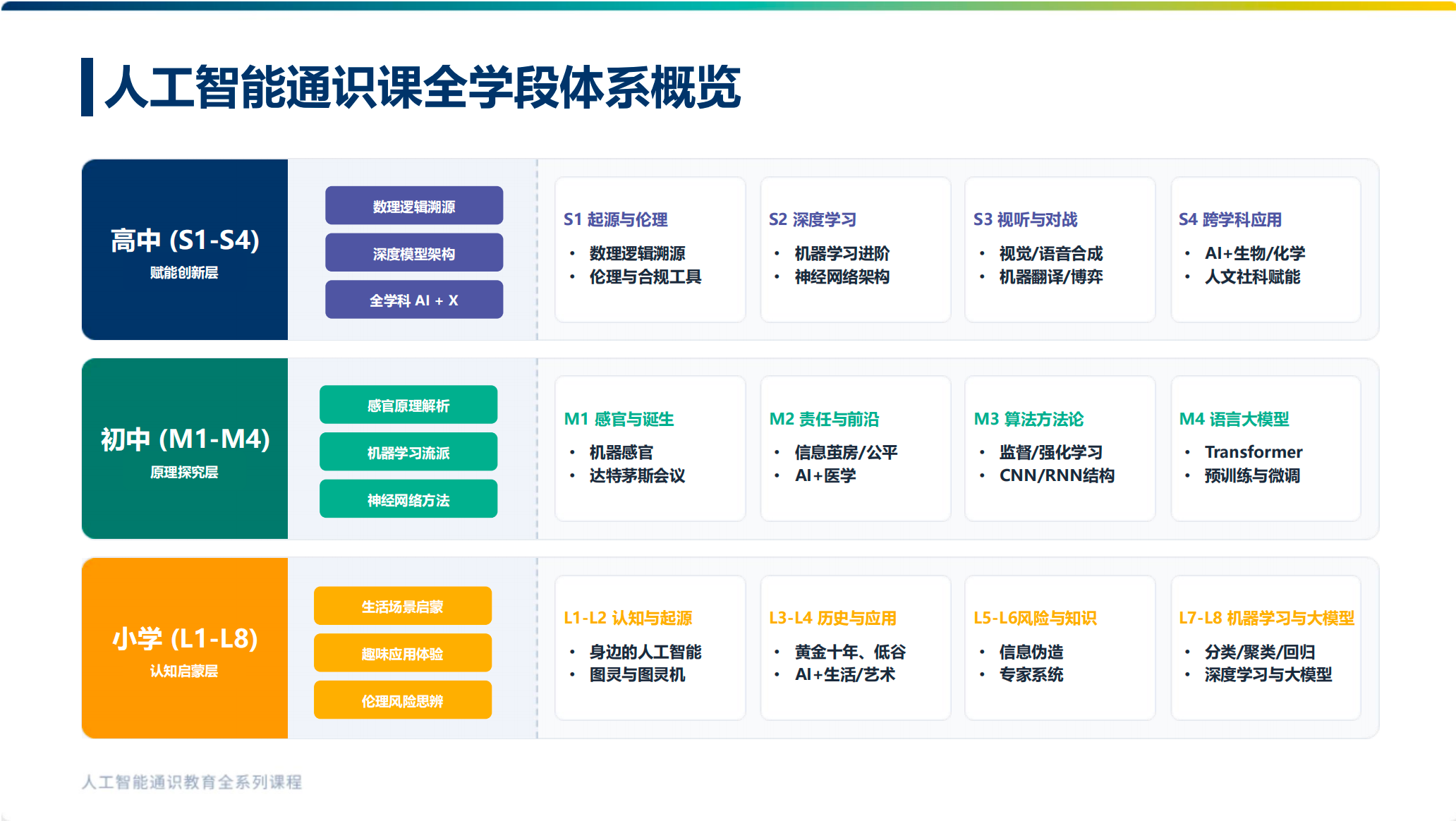 小学阶段(L1-L8)为认知启蒙层,帮助孩子们建立AI时代的基础认知体系,点燃探索AI的兴趣;初中阶段(M1-M4)进入原理探究层,引导学生揭开人工智能的“黑盒”,建立对AI技术的理性认知;高中阶段(S1-S4)升级为赋能创新层,培养学生运用AI进行跨学科创新和解决复杂问题的能力,为未来升学与发展筑牢根基。