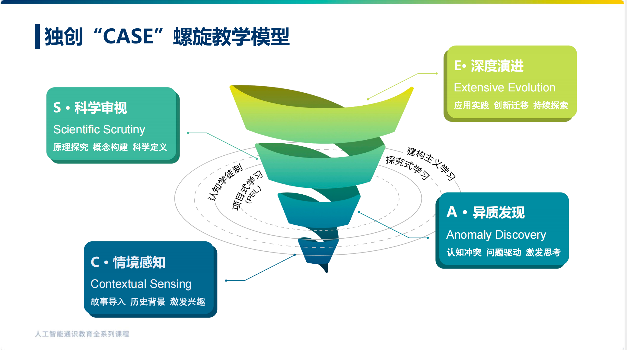 为进一步夯实教学实效,让AI教育更具科学性,爱宾果独创“CASE”螺旋教学模型,以“案例”为起点,在螺旋演进中引导学生实现从感性理解到深度认知的跨越,构建“情境感知—异质发现—科学审视—深度演进”的完整教学闭环,背后融合了建构主义学习、探究式学习等多种先进教学设计理论,无需复杂讲解,让优质教学自然落地。