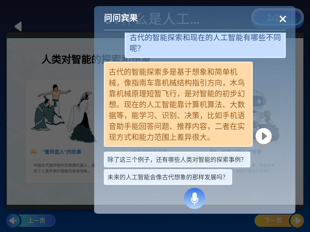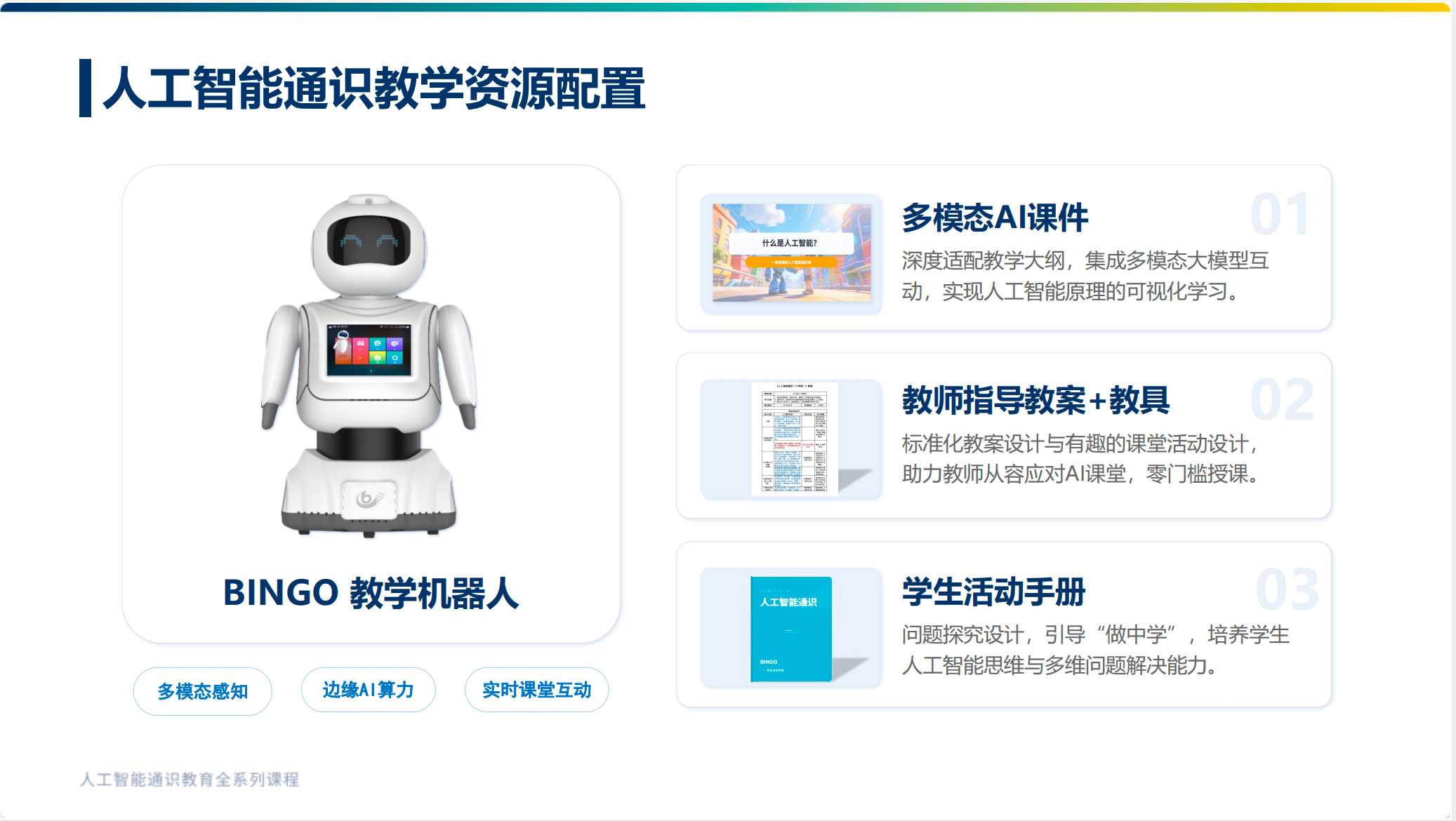 课程配套的多模态AI课件,深度适配教学大纲,集成多模态大模型互动功能,将抽象的AI原理可视化,搭配AI助教机器人的实时互动讲解,让晦涩知识变得生动易懂;教师指导教案+教具,助力教师零门槛授课,从容应对AI课堂,与人机双师模式形成互补;学生活动手册以问题探究为核心,引导学生“做中学”。