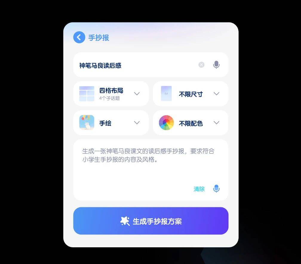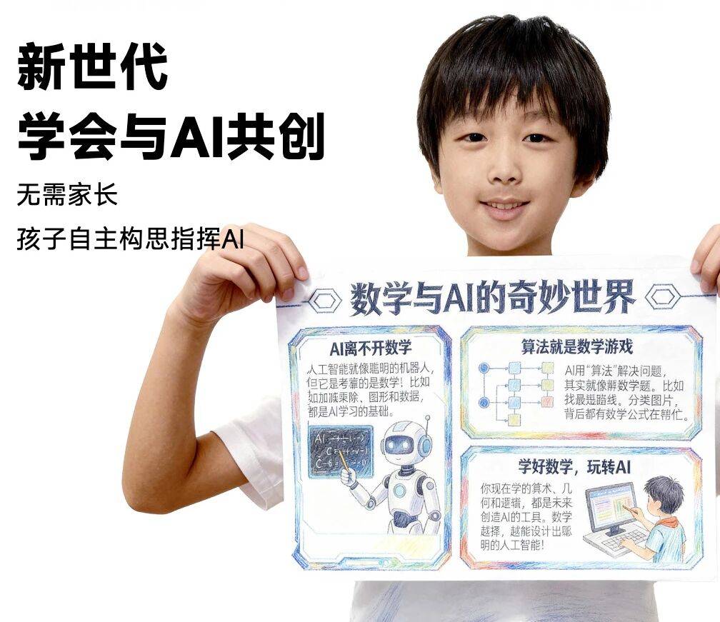 从构思到布局,从配色到插图,AI全面协助,原本需要数小时的工作,几分钟内轻松完成。让孩子从重复性劳动中解放出来,只专注于真正的创意与表达,带给孩子满满的成就感!