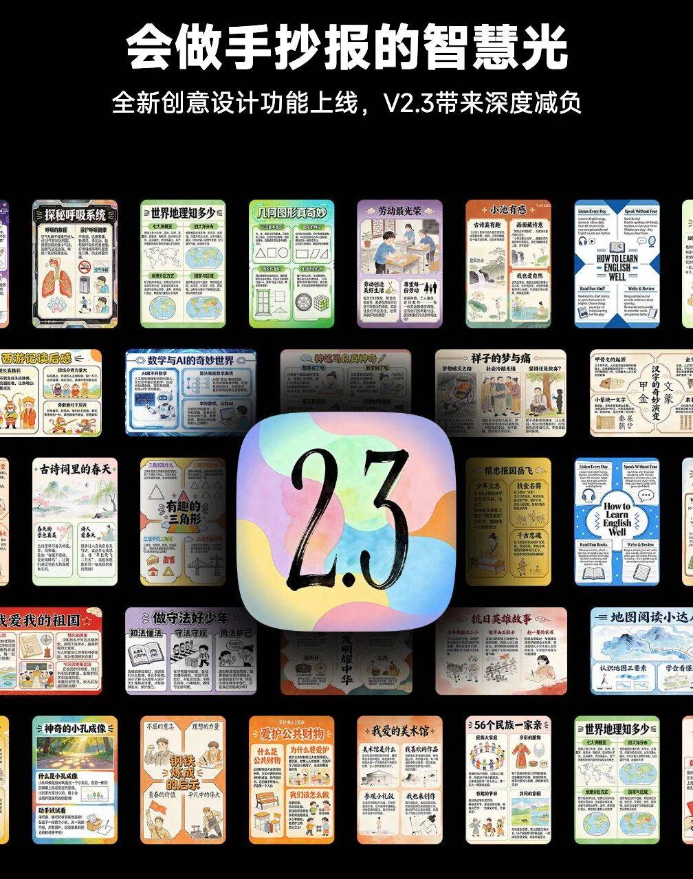 宾果智慧光V2.3的到来,精准击破手抄报创作这一家长高频痛点,以强大的AI创意设计功能,让孩子实现自主创作,也让家长彻底解放双手。