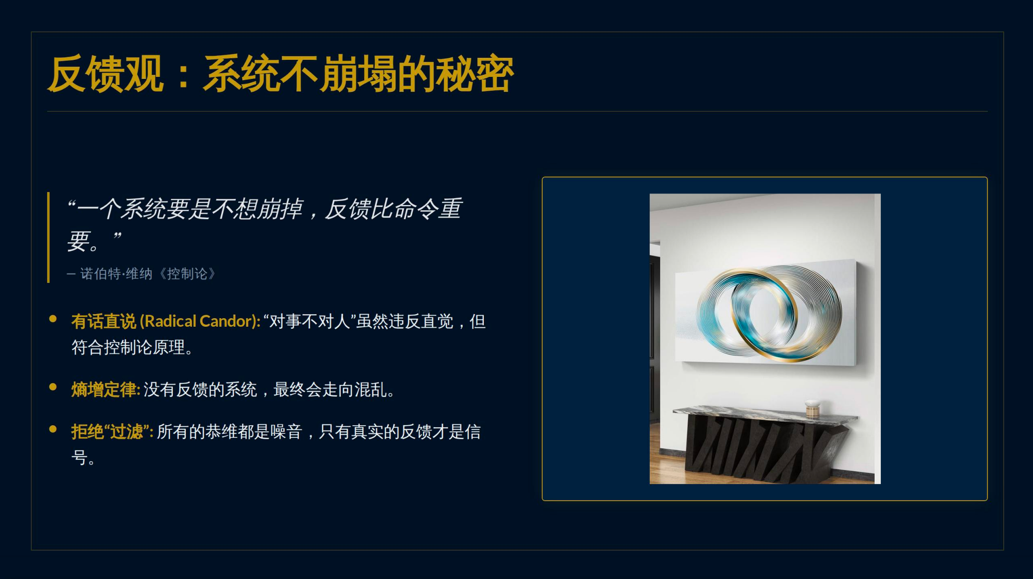 反馈的本质在于构建闭环:首先下达指令,然后系统执行,最终通过反馈回路将执行结果传回,从而形成调节与优化。这一闭环不仅存在于机械系统之中,也同样贯穿于每一个组织体的运作里。