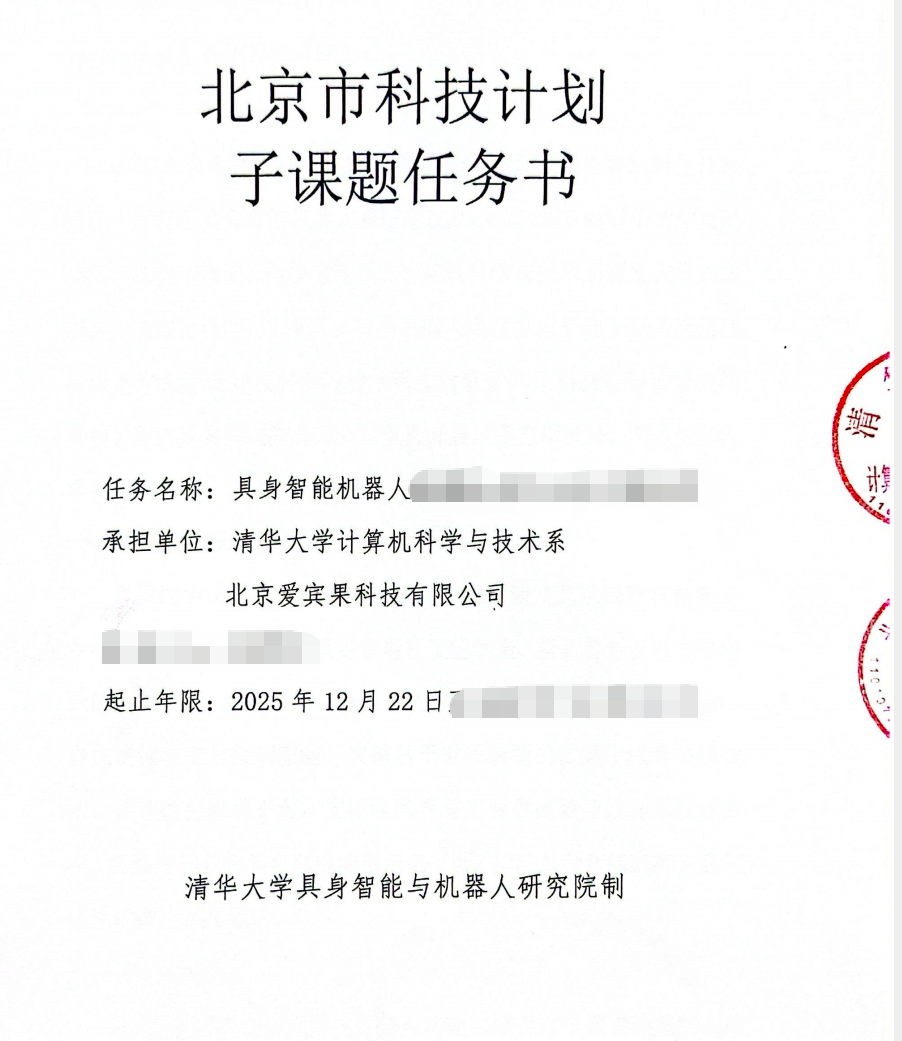 课题由清华大学具身智能与机器人研究院、机械工程系的科研团队牵头,爱宾果凭借在机器人感知、AI、交互三大领域的技术积淀,成为课题落地转化的核心企业力量,实现高校科研创新与企业产业化能力的精准互补,构建“科研攻关+成果转化”的协同生态。