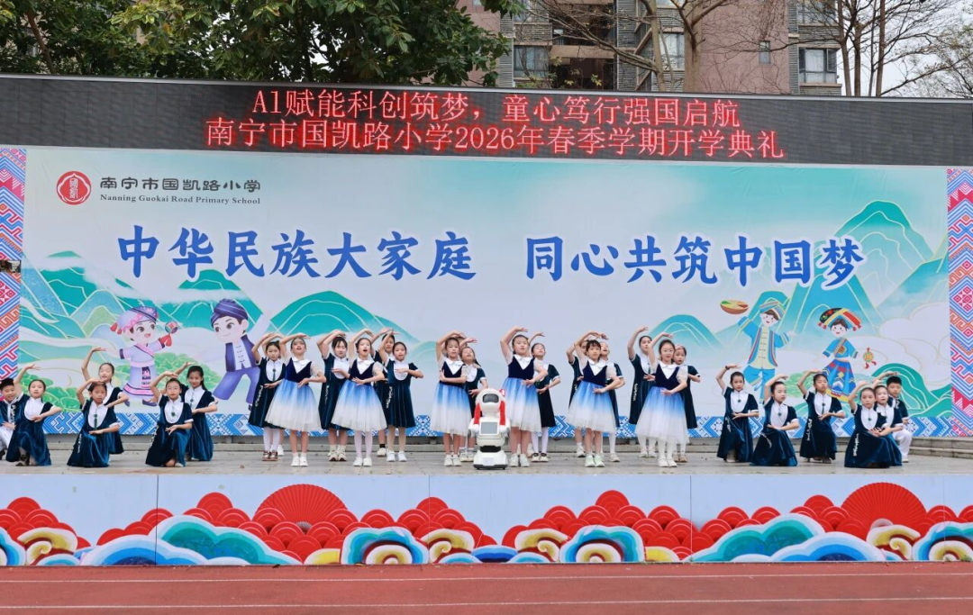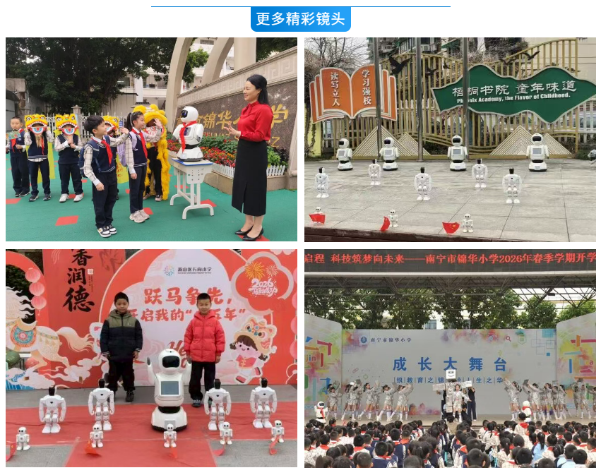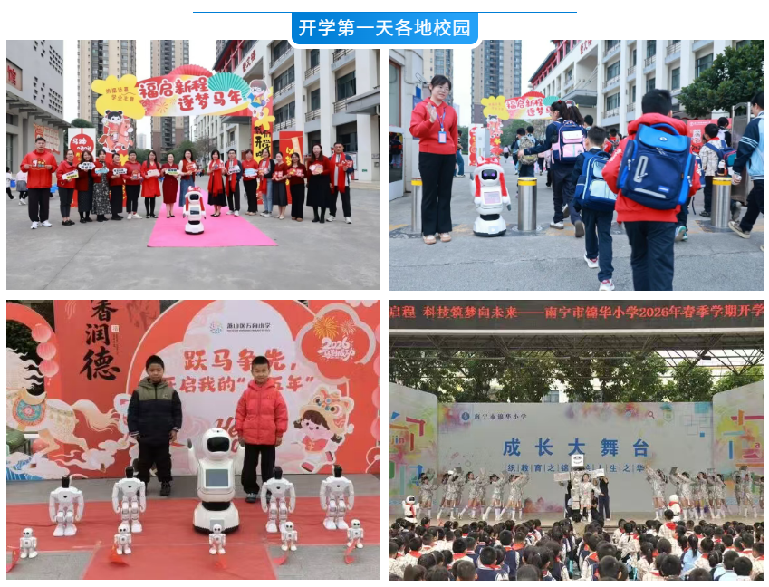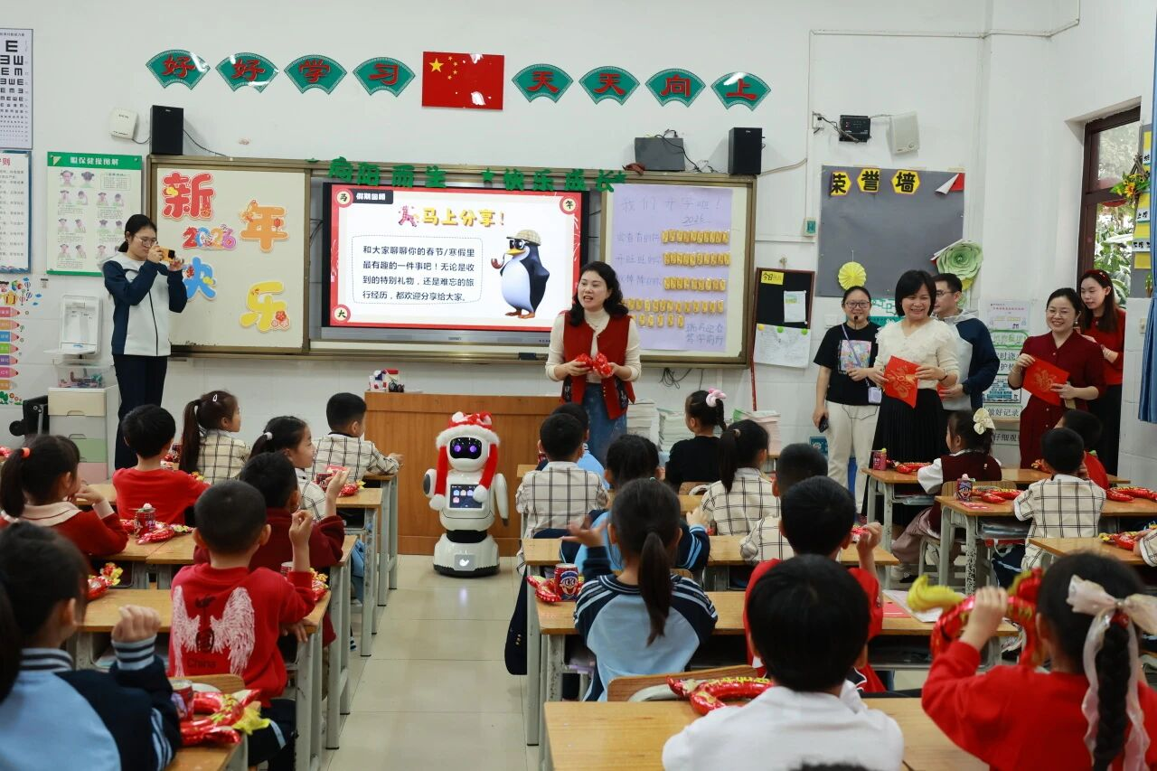 而在南宁市国凯路小学,开学典礼结束后,校领导携手机器人“宾果”走进各班教室,为同学们送上香甜的糖果与暖心的新年祝福。