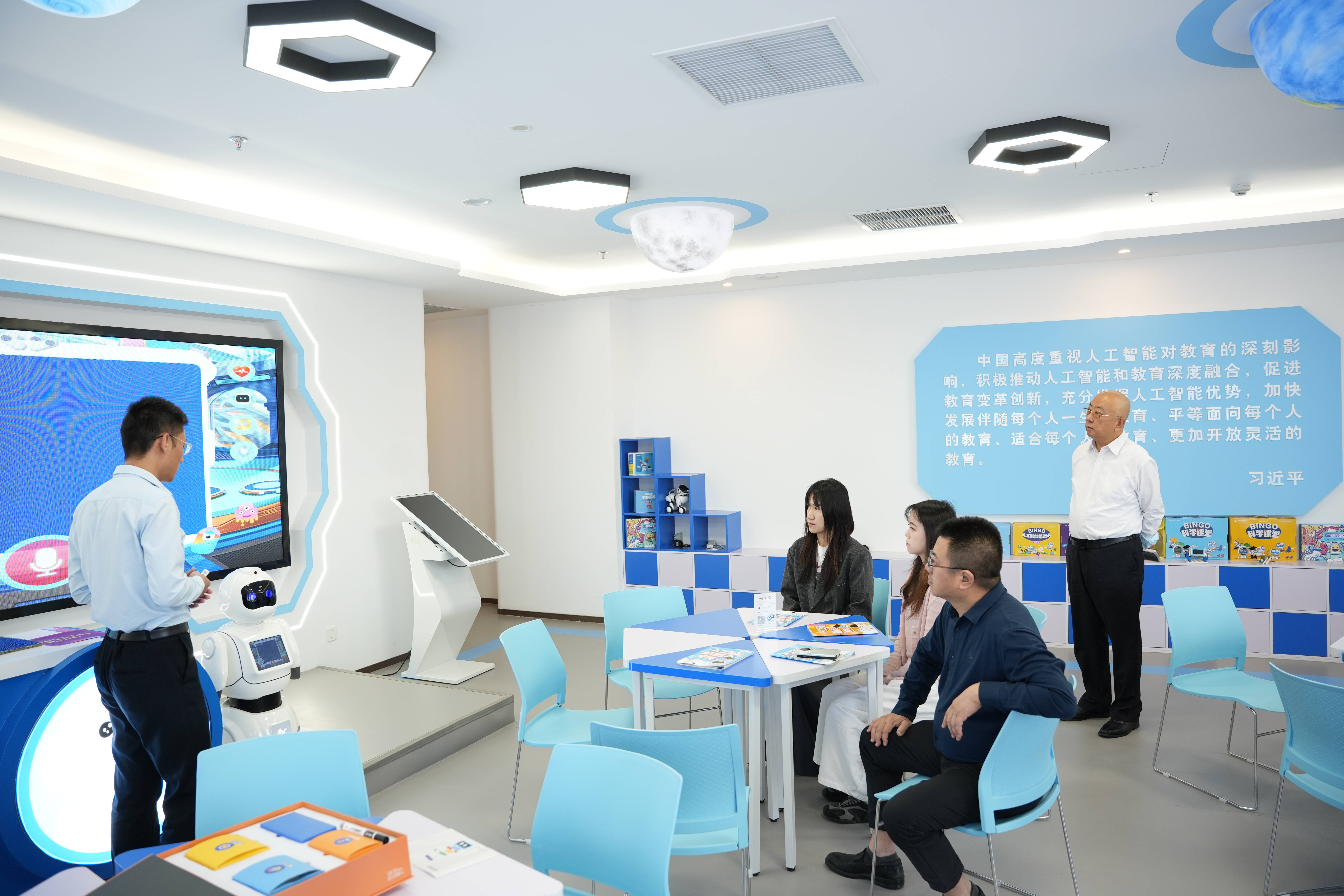 范丛明会长一行首先走进爱宾果智慧展厅与AI科技教室,沉浸式体验了公司在教育具身智能领域的核心技术与创新成果。